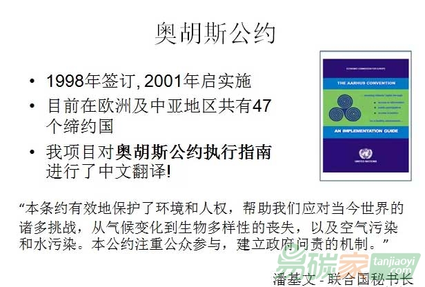 談歐洲國家的環(huán)境信息公開,必須要先介紹《奧胡斯公約》。該公約是歐洲最重要的環(huán)境和公眾參與方面的法律,現(xiàn)在已有47個締約國。歐盟只有20多成員國,其余20多個不是歐洲的,中亞的哈薩克斯坦也是締約國。該公約已經(jīng)生效十多年了,歐洲很多國家沒有達到公約中的一些要求。我建議大家看看正文,我們已翻譯成中文,它還配套了200頁的《執(zhí)行指南》,收納了締約國的最佳經(jīng)驗。