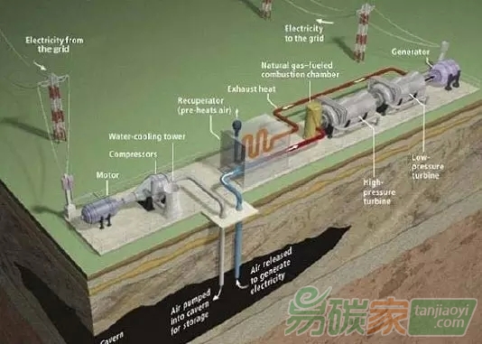 不足之處:一大缺陷在于效率較低。原因在于空氣受到壓縮時溫度會升高,空氣釋放膨脹的過程中溫度會降低。在壓縮空氣過程中一部分能量以熱能的形式散失,在膨脹之前就必須要重新加熱。通常以天然氣作為加熱空氣的熱源,這就導(dǎo)致蓄能效率降低。還有可以想到的不足就是需要大型儲氣裝置、一定的地質(zhì)條件和依賴燃燒化石燃料。