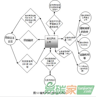 碳金融商業(yè)模式的定位,崔克羅納公司業(yè)務(wù)系統(tǒng)可以分為三個(gè)部分:一是圍繞項(xiàng)目業(yè)主展開服務(wù),并在一級(jí)