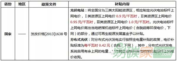 2013年8月,國家發(fā)改委發(fā)布《關(guān)于發(fā)揮價(jià)格杠桿作用促進(jìn)光伏產(chǎn)業(yè)健康發(fā)展的通知》(發(fā)改價(jià)格[2013]1638號(hào)),明確分布式光伏發(fā)電項(xiàng)目的補(bǔ)貼標(biāo)準(zhǔn)為0.42元/千瓦(含稅)。