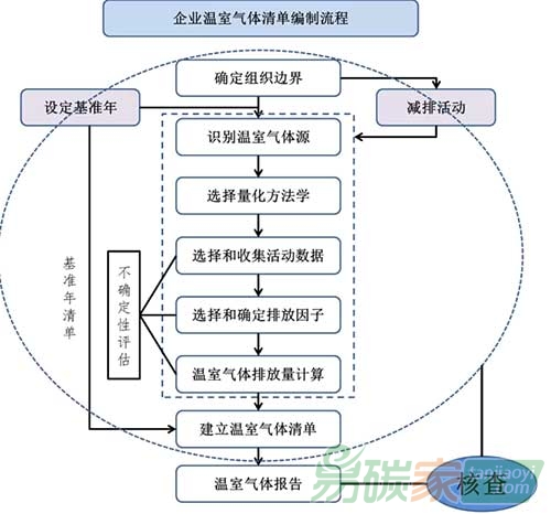 標(biāo)準(zhǔn)明確規(guī)定了編制企業(yè)溫室氣體清單和核算排放量的流程。如下圖所示: