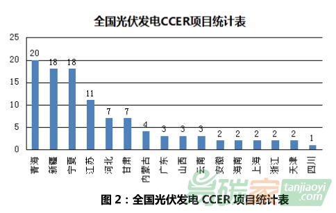 2013年10月下旬,中國(guó)首個(gè)CCER項(xiàng)目在中國(guó)自愿減排交易信息平臺(tái)上公示,此后,CCER項(xiàng)目的數(shù)量迅速增加。截止到2015年4月13日,共有605個(gè)CCER項(xiàng)目正在或已完成審定公示,其中光伏發(fā)電CCER項(xiàng)目有105個(gè)(見(jiàn)圖2),合計(jì)年減排量約396萬(wàn)噸。