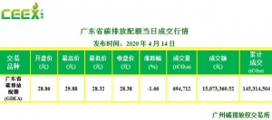 4月14日,廣東碳市場(chǎng)成交配額694,712噸(含協(xié)議轉(zhuǎn)讓400,000噸,回購(gòu)交易290,000噸),成交金額15,073,360.52元,開(kāi)盤(pán)價(jià)28.86元/噸,收盤(pán)價(jià)28.38元/噸,較前一交易日下跌1.66%。 截至4月14日,廣東碳市場(chǎng)累計(jì)成交配額 ... ...