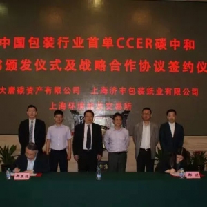 中國包裝行業(yè)首單CCER碳中和證書頒發(fā)儀式及戰(zhàn)略合作協(xié)議簽約儀式 今年初正式組建的大唐碳資產(chǎn)有限公司成功完成了其自成立以來的首次亮相,使用大唐集團的一個可再生能源項目的減排指標幫助一家包裝紙業(yè)公司上海濟豐 ...